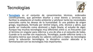 Este documento define las tecnologías de la información y la comunicación (TIC). Define tecnología como el conjunto de conocimientos técnicos que permiten crear bienes y servicios para satisfacer las necesidades humanas. Luego define información como un conjunto organizado de datos procesados que constituyen un mensaje que cambia el estado de conocimiento de quien lo recibe, y comunicación como el proceso mediante el cual se transmite información de una entidad a otra a través de signos compartidos.