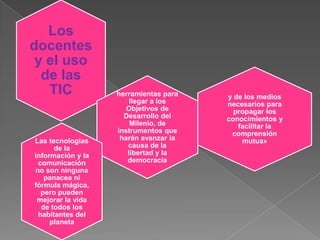 Las TIC son el conjunto de recursos, procedimientos y técnicas usadas para procesar, almacenar y transmitir información. Actualmente, el procesamiento de información ya no se limita a las computadoras, sino que incluye dispositivos móviles como teléfonos inteligentes y computadoras portátiles con capacidad de conectividad inalámbrica. Las TIC pueden usarse como herramientas para alcanzar los Objetivos de Desarrollo del Milenio y promover la libertad y la democracia, aunque no son una
