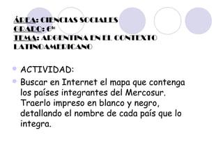 Este documento contiene tres resúmenes de actividades educativas para diferentes grados y áreas de estudio. La primera actividad es para el sexto grado de ciencias sociales y consiste en buscar e imprimir un mapa del Mercosur. La segunda actividad es para tercer grado de ciencias naturales y pide fotografiar y pegar imágenes que muestren los diferentes estados del agua. La tercera actividad es para cuarto grado de ciencias sociales y propone ver un video sobre la independencia de Argentina y debatir sobre su contenido.
