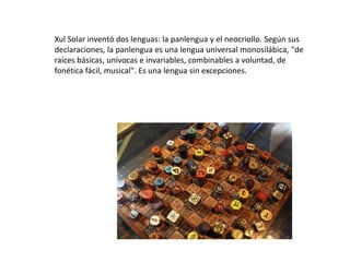 Xul Solar fue un pintor, escultor e inventor de idiomas imaginarios argentino nacido en 1887. Fue un personaje excéntrico interesado en astrología, ciencias ocultas, idiomas y mitologías que inventó dos lenguas, la panlengua y el neocriollo. Tuvo varias exposiciones individuales y colectivas en Buenos Aires y en ciudades europeas como París y Milán entre 1920 y 1929. Algunas de sus obras más conocidas se exhiben actualmente en el Museo Xul Solar de Buenos Aires.