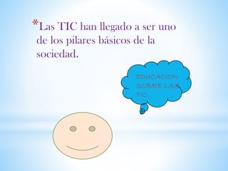 El documento discute la importancia creciente de las TIC en la sociedad y cómo pueden usarse para crear un mundo mejor. También menciona que la gente a veces dice cosas que no son ciertas y que la privacidad del individuo es muy importante. Además, explica brevemente la Web 2.0 y cómo permite a los usuarios compartir información e interactuar a través de herramientas y servicios en línea.