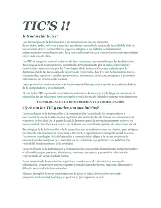 Las Tecnologías de la Información y la Comunicación (TIC) son un conjunto de servicios, redes, software y aparatos que mejoran la calidad de vida de las personas al procesar, almacenar, sintetizar y presentar información de forma interconectada. Las TIC incluyen tanto las tecnologías de comunicación tradicionales como la radio y la televisión, como las tecnologías de información digitales. El uso de las TIC ha cambiado significativamente la sociedad a través de la educación, las relaciones e intercambio de