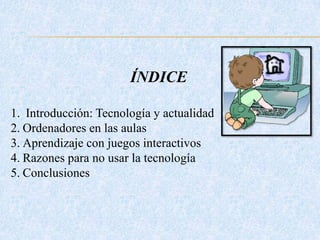 Este documento explora el uso de las nuevas tecnologías como herramientas de aprendizaje en el aula. Discuta cómo los ordenadores y los juegos interactivos pueden mejorar el aprendizaje, pero también reconoce algunas razones por las que los profesores pueden ser reacios a usar la tecnología, como una falta de comprensión de su valor pedagógico o dificultades técnicas. Concluye que las tecnologías deben usarse de una manera que realce al estudiante como protagonista de su propio apre
