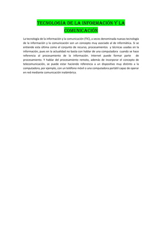 La tecnología de la información y la comunicación (TIC) se refiere al conjunto de recursos, procesos y técnicas utilizados para procesar información, incluyendo computadoras, internet y dispositivos móviles conectados a través de comunicaciones inalámbricas.