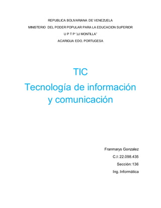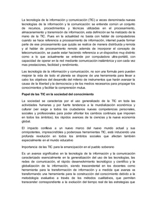 Las tecnologías de la información y la comunicación (TIC) se refieren a recursos, procedimientos y técnicas utilizadas para procesar, almacenar y transmitir información. Las TIC han cambiado la forma en que las personas se comunican y acceden a la información. La sociedad del conocimiento se caracteriza por el uso generalizado de las TIC en todas las actividades humanas. Las TIC también están transformando la educación y son una herramienta importante para la construcción del conocimiento y la emancipación del pueblo.