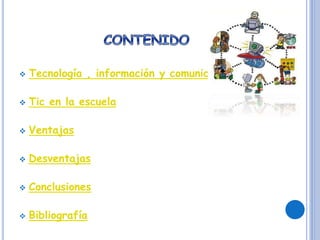 Este documento discute el tema de la tecnología de la información y la comunicación (TIC) en la escuela. Explica que las TIC permiten manipular, almacenar y transmitir información usando computadoras y redes. Las TIC crean entornos de aprendizaje más atractivos e interesantes que potencian el autoaprendizaje y benefician a estudiantes con necesidades especiales. Sin embargo, también tienen desventajas como no fomentar la reflexión crítica. El documento concluye que las TIC, cuando se usan a