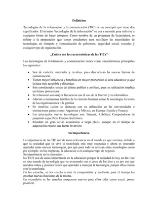 El documento define las tecnologías de la información y la comunicación (TIC) y describe sus características principales, como ser innovadoras, influyentes en la educación, y relacionadas con el uso de Internet y la computación. Explica que las TIC son importantes en la sociedad moderna porque la tecnología avanza rápidamente y es necesaria en empresas, educación y negocios. Finalmente, destaca la importancia de las TIC en la educación para que los estudiantes aprendan sobre tecnología y en las empresas, donde las TIC están revolucionando los