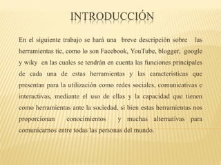 Este documento describe brevemente las principales herramientas TIC como Facebook, YouTube, Blogger, Google y Wiki. Detalla sus funciones clave y características, incluyendo que Facebook es una red social creada por Mark Zuckerberg, YouTube permite subir y ver videos, Blogger permite crear bitácoras en línea sin código, Google es el motor de búsqueda más utilizado y Wiki permite que múltiples usuarios editen contenido de manera colaborativa.
