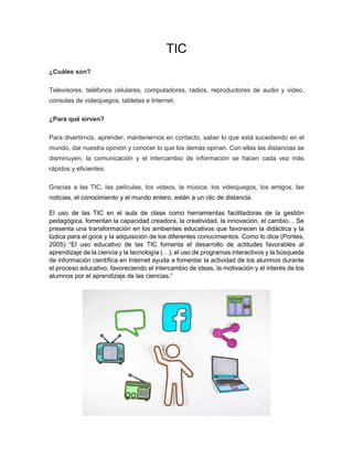 Las TIC incluyen dispositivos como televisores, teléfonos celulares, computadoras, radios y reproductores de audio y video que sirven para divertirnos, aprender, mantenernos comunicados y estar informados sobre el mundo. Gracias a las TIC, el contenido y la información están disponibles con solo hacer clic y las distancias se reducen para una comunicación más rápida. Su uso en el aula fomenta la creatividad, la innovación y un cambio en los ambientes educativos que favorecen una enseñanza didáctica y lúdic