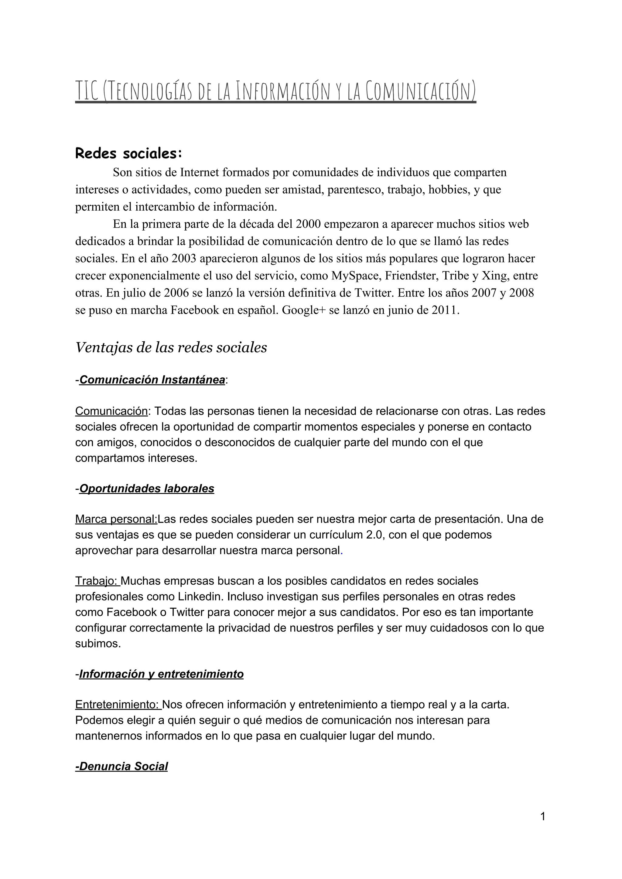 El documento describe las tecnologías de la información y la comunicación (TIC), redes sociales, ventajas y desventajas de las redes sociales, tecnologías inalámbricas, hardware de conexión. Explica que las redes sociales son sitios web que permiten a las personas compartir intereses e información, y que surgieron en la década de 2000 sitios populares como Facebook y Twitter. También describe brevemente las ventajas como la comunicación y oportunidades laborales, y desventajas como estafas, privacidad y ciberac
