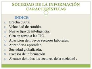 El documento describe las características de la sociedad de la información, incluyendo la brecha digital, el rápido cambio tecnológico, la inteligencia distribuida, la dependencia de las TIC, la aparición de nuevos sectores laborales como el teletrabajo, la necesidad de aprender a aprender de forma continua, la globalización, los excesos de información, y el impacto en todos los sectores de la sociedad, especialmente la educación.
