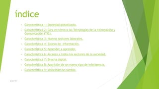 Este documento describe 9 características clave de la sociedad de la información: 1) Es una sociedad globalizada con fenómenos económicos, sociales y culturales a nivel mundial. 2) Gira en torno a las tecnologías de la información y la comunicación. 3) Ha creado nuevos sectores laborales como el teletrabajo.