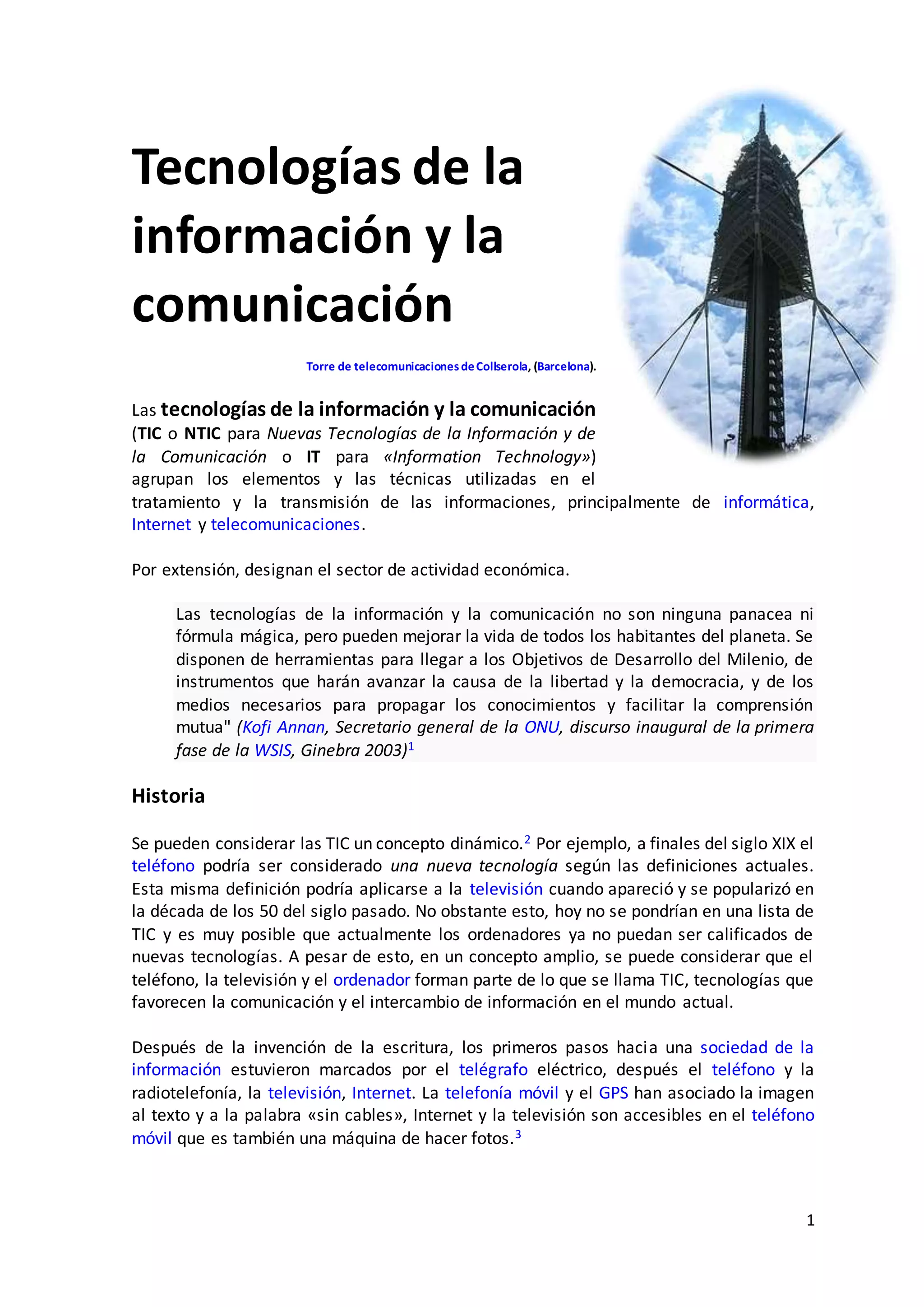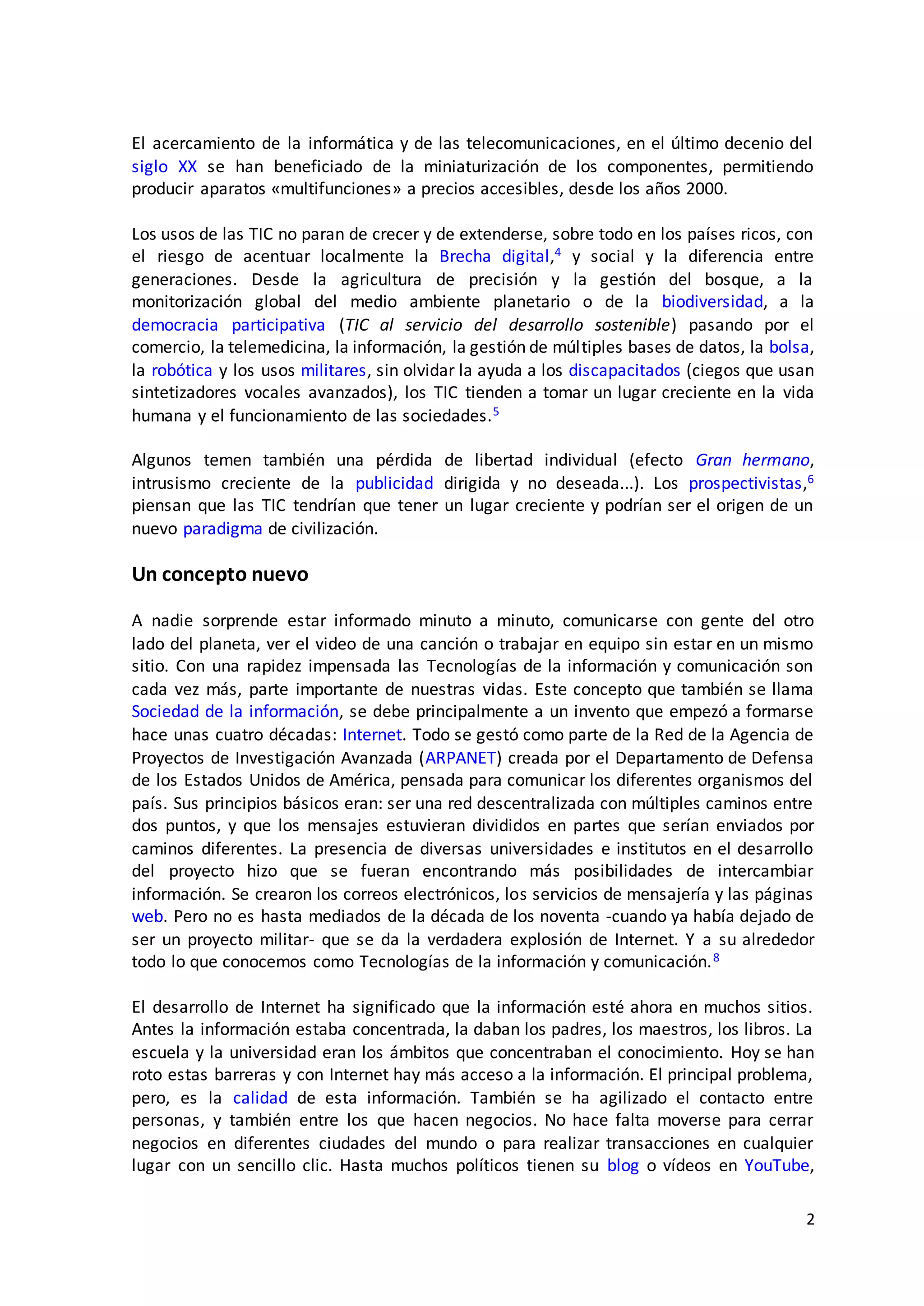 Las tecnologías de la información y la comunicación (TIC) engloban herramientas para el tratamiento y transmisión de información, mejorando aspectos sociales y económicos, aunque también pueden acentuar la brecha digital. El desarrollo de internet ha democratizado el acceso a la información y ha revolucionado la comunicación, afectando todas las áreas de la vida contemporánea. A pesar de sus beneficios, surgen preocupaciones sobre la calidad de la información y la pérdida de libertad individual debido a la creciente intrusión de la tecnología en la vida diaria.
