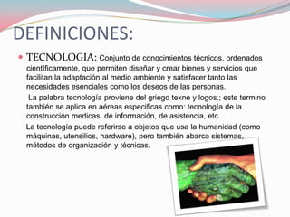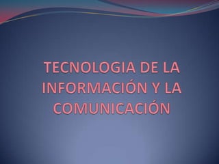 El documento define tecnología, información, comunicación y las TIC. Explica que la tecnología se refiere a objetos y sistemas que usa la humanidad para satisfacer necesidades y deseos. La información son datos organizados que permiten resolver problemas. Las TIC son tecnologías que permiten almacenar, comunicar e intercambiar información de manera inmaterial e instantánea a través de aplicaciones multimedia e interactivas. Las TIC amplían las capacidades humanas y facilitan el acceso a información para el desarrollo social.