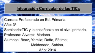 Este documento presenta información sobre la integración curricular de las tecnologías de la información y la comunicación (TICs) en el nivel primario. Define la integración curricular de las TICs como el proceso de hacerlas parte integral del plan de estudios mediante su planificación y uso en el aula para apoyar el aprendizaje de contenidos académicos. Explica que requiere una filosofía que valore sus posibilidades didácticas y un cambio de rol tanto para profesores como alumnos. Además, presenta modelos