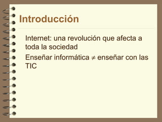 Este documento resume los principales usos educativos de Internet y sus implicaciones para profesores y alumnos. Internet proporciona materiales didácticos, herramientas de comunicación y apoyo a las tareas del profesor y la administración. Esto requiere hardware, software, recursos humanos y formación continua. El profesor debe saber usar las herramientas TIC, evaluar recursos y estar dispuesto a seguir formándose. Su trabajo se vuelve más de guía que de clases magistrales, y potencia el trabajo colaborativo y la evaluación automática.