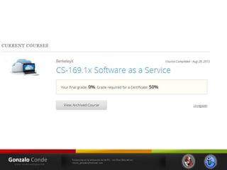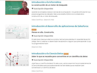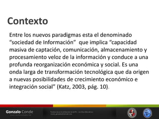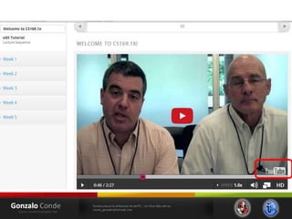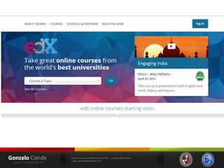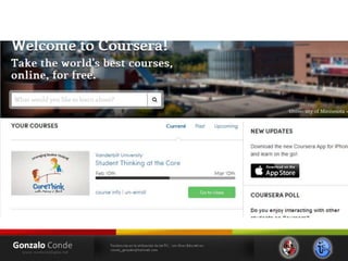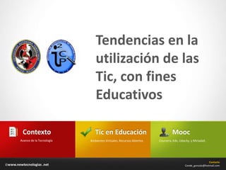 Este documento resume las tendencias en el uso de las tecnologías de la información y la comunicación (TIC) con fines educativos. Explica conceptos como ambientes virtuales de aprendizaje, cursos masivos en línea abiertos (MOOC), y las principales plataformas de MOOC como Coursera, edX, Udacity y MiriadaX. También analiza cómo las nuevas generaciones usan intensamente las tecnologías digitales y cómo esto podría modificar sus habilidades cognitivas.