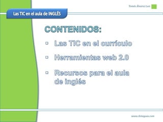 El documento habla sobre el uso de las TIC en la educación. Menciona que las TIC permiten que los estudiantes creen contenido y que se debe trabajar en diferentes áreas del conocimiento. También describe conceptos clave de la Web 2.0 como blogs, wikis, redes sociales, RSS y etiquetas. Finalmente, incluye enlaces a recursos para el aula de inglés en la web.