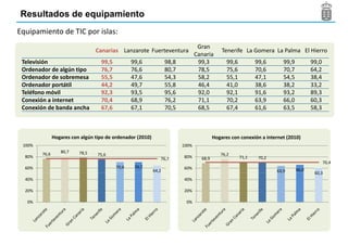Este documento presenta los resultados de una encuesta sobre el equipamiento y uso de las tecnologías de la información y la comunicación (TIC) en los hogares de Canarias en 2010. Algunos de los hallazgos clave son: 1) Casi todos los hogares tenían televisión y teléfono móvil, mientras que aproximadamente tres cuartas partes tenían ordenador y conexión a Internet; 2) El uso de TIC varió según factores como isla, tamaño del municipio, edad y nivel educativo; 3) Las tasas de uso de Internet