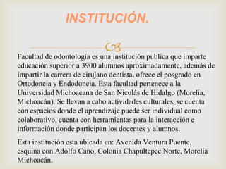 La facultad de odontología de la Universidad Michoacana de San Nicolás de Hidalgo carece de equipo odontológico actualizado y suficiente. También hay una falta de espacios para la práctica odontológica debido a la alta demanda de estudiantes. Aunque la facultad cuenta con algunas herramientas tecnológicas como una sala de computo y wifi, éstas son insuficientes y no se aprovechan completamente. Se propone actualizar las plataformas de aprendizaje e implementar más herramientas como