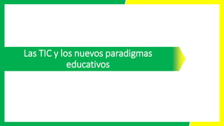 Este documento describe la evolución de los paradigmas educativos y el impacto de las tecnologías de la información y la comunicación (TIC) en la educación. Explica las cinco etapas clave de la integración de las TIC en la educación desde 1975 y cómo han cambiado los roles de profesores y estudiantes. También distingue entre "nativos digitales" e "inmigrantes digitales" y sus diferentes habilidades con la tecnología.