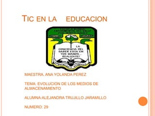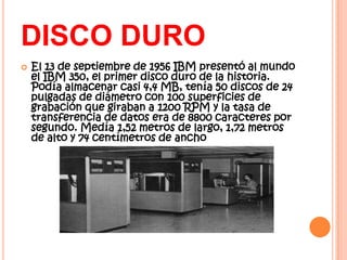 Este documento describe la evolución de varios medios de almacenamiento de datos a través de la historia, incluyendo el primer disco duro presentado por IBM en 1956 con una capacidad de 4.4 MB, la memoria de tambor inventada en 1932 capaz de almacenar hasta 10 KB, y el uso extendido de memorias USB a partir de los años 1990 como un medio popular de almacenamiento y transporte de datos personales.