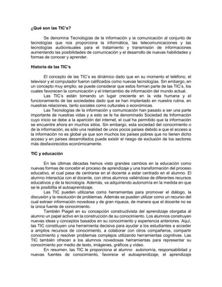 El documento describe las tecnologías de la información y la comunicación (TIC), su historia y su papel en la educación. Explica que las TIC incluyen computadoras, internet y tecnología audiovisual y cómo han transformado la educación al centrarse más en el estudiante. También destaca los beneficios de las TIC para apoyar el aprendizaje autónomo, colaborativo y la resolución de problemas, así como los desafíos de su implementación como la capacitación de docentes y problemas de acceso.