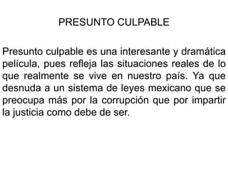 La película Presunto Culpable refleja las situaciones reales de la justicia penal en México, donde el sistema se preocupa más por la corrupción que por impartir justicia. La historia sigue a Toño, quien es acusado de asesinato por un testigo, y es condenado dos veces a pesar de las irregularidades en su caso. Después de dos años en prisión, sus abogados logran llevar el caso a los magistrados y consiguen que sea liberado. La película muestra la realidad de la corrupción y burocracia en los j