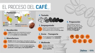 El documento proporciona información sobre la industria del café, incluyendo las etapas de la cadena de suministro desde la plantación hasta la preparación, los principales países productores y consumidores, las tendencias del mercado de café como el auge de las cafeterías especializadas, y el potencial de aplicar soluciones digitales y IoT a la industria del café.