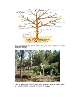 La poda es el proceso de recortar árboles y arbustos. Puede aumentar el rendimiento de frutos y dar forma a los árboles. Se realizan diferentes tipos de poda como la de copa, formación y aclareo para controlar el tamaño y forma de los árboles. La poda debe hacerse con cuidado y en la época adecuada para cada planta.