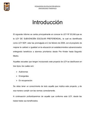 Este documento resume la Ley de Subvención Escolar Preferencial (SEP) en Chile, la cual entrega recursos adicionales a escuelas con alumnos en situaciones de vulnerabilidad socioeconómica. La ley clasifica las escuelas en autónomas, emergentes o en recuperación, y define a los alumnos prioritarios que son beneficiados. El resumen explica el objetivo de mejorar la calidad e igualdad educativa, los beneficios para los alumnos prioritarios y el proceso de postulación de las escuelas a la ley SE