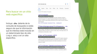 Este documento proporciona instrucciones sobre cómo realizar diferentes tipos de búsquedas avanzadas en Google, incluyendo el uso de comillas para búsquedas de frases exactas, el operador "site:" para limitar los resultados a un sitio web en particular, y el uso de "define:" para obtener definiciones de palabras. También explica cómo realizar búsquedas por rangos numéricos, texto en el cuerpo de una página, palabras obligatorias en los resultados, y formatos de archivo específicos.