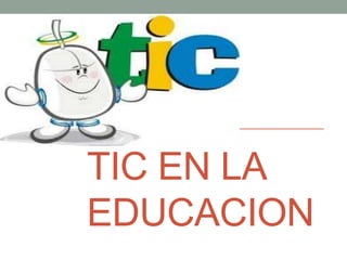 El documento discute el uso de las tecnologías de la información y la comunicación (TIC) en la educación. Indica que las TIC pueden contribuir al acceso universal a la educación, la igualdad en la enseñanza, la calidad de la enseñanza y el aprendizaje, y la gestión eficiente del sistema educativo. También describe las ventajas y desventajas de las TIC tanto para estudiantes como para profesores.