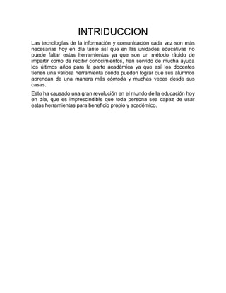 El documento describe el papel importante que juegan las tecnologías de la información y la comunicación (TIC) en la educación. Explica que las TIC pueden mejorar el acceso a la educación, promover la igualdad, mejorar la enseñanza y el aprendizaje, y facilitar una gestión más eficiente de los sistemas educativos. Además, investigaciones han demostrado que las TIC pueden conducir a mejorar el rendimiento estudiantil. El documento concluye que las TIC son herramientas muy útiles que facilitan la inter