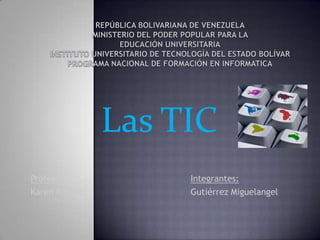 El documento discute el uso de las tecnologías de la información y la comunicación (TIC) en la educación en Venezuela. Señala que las TIC han causado grandes transformaciones en la sociedad y la educación, y que los docentes deben capacitarse en su uso para mejorar la enseñanza. También destaca que las TIC permiten a los estudiantes acceder a más información y desarrollar habilidades como la investigación y la comunicación.