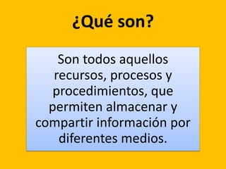 El documento habla sobre las tecnologías de la información y la comunicación (TIC). Explica que las TIC permiten almacenar y compartir información por diferentes medios y han traído cambios sociales, económicos y culturales profundos. También discute cómo las TIC pueden usarse de cuatro maneras en educación: como medio de expresión, comunicación, fuente de información y medio didáctico. Finalmente, enfatiza la necesidad de que los profesores innoven y aprendan junto con los estudiantes en este siglo para hacer