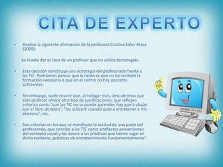 El documento analiza las actitudes de los profesores hacia las tecnologías de la información y la comunicación (TIC) en el aula. Algunos profesores no las usan, justificándose con que las TIC no son útiles para el aprendizaje o son solo para entretener. Se necesita capacitar mejor a los profesores en el uso pedagógico de las TIC y renovar sus métodos para una enseñanza más interactiva entre alumnos y profesores con el apoyo de las herramientas tecnológicas.