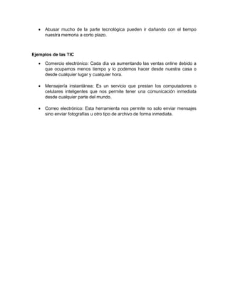 Las tecnologías de la información y la comunicación (TIC) son herramientas que permiten la transmisión, procesamiento y almacenamiento digital de información, cambiando nuestra forma de vida e impulsando la invención de nuevos bienes y servicios. Las TIC ofrecen mayor velocidad, capacidad y distribución de la información para la comunicación global, transacciones comerciales y acceso a conocimientos y cursos en línea de forma ahorrativa. Algunos ejemplos de TIC son el comercio electrónico, la mensajería