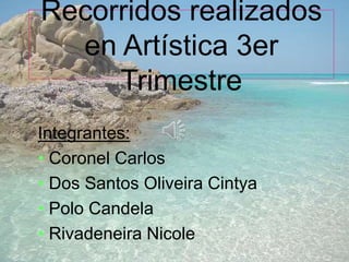 El documento resume los recorridos realizados por el curso de Artística 3er Trimestre, incluyendo visitas a iglesias en San Salvador de Jujuy y en el norte de la provincia de Jujuy. También menciona la participación del grupo en la octava edición del encuentro de teatro popular latinoamericano "Entepola" en octubre, y su asistencia a la obra de teatro "Huellas sin remitente desconocido". Por último, brinda información sobre la exposición Expojuy 2016 y la visita del curso al Festival de