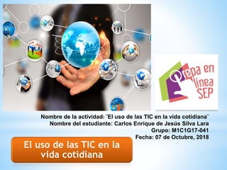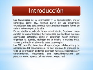 El documento describe los usos de las Tecnologías de la Información y la Comunicación (TIC) en la vida cotidiana, el hogar, el ámbito educativo y el laboral. Las TIC se han vuelto parte integral de la vida diaria al facilitar actividades como comunicación, entretenimiento y trabajo. En el hogar, las TIC más utilizadas son el teléfono, la televisión e internet. En la educación, las TIC mejoran la presentación de contenidos de forma interactiva. En el trabajo, las TIC transformaron la búsqueda y contratación