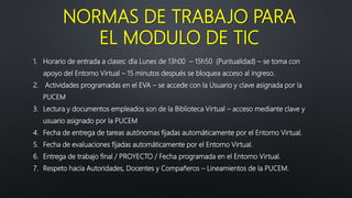 Este documento presenta información sobre el uso de las tecnologías de la información y comunicación (TIC) en un curso. Explica las normas de trabajo para el módulo de TIC, los tipos y parámetros de evaluación, y los requisitos mínimos para aprobar la materia. También incluye contenido sobre redes sociales como Facebook y Twitter, con instrucciones para el registro y uso básico de estas plataformas.