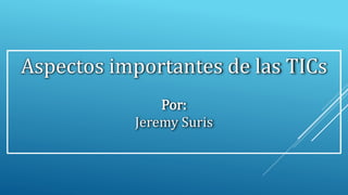 El documento describe los aspectos positivos y negativos del uso de las tecnologías de la información y la comunicación (TICs). Entre los aspectos positivos se encuentran la capacidad de digitalizar y almacenar grandes cantidades de información, transmitir información de forma instantánea a distancia, y el desarrollo de aplicaciones multimedia e interactivas. Sin embargo, también menciona aspectos negativos como la ciudadanía pasiva, la desorientación por la gran cantidad de información disponible, y la prevalencia del consumo sobre la creatividad.