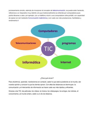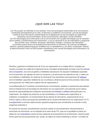 Las TICs pueden definirse como tecnologías tradicionales de comunicación como la radio y la televisión, y tecnologías modernas de información como la computación digital. Las TICs son tecnologías necesarias para gestionar y transformar información usando computadoras y programas. Los primeros pasos hacia una sociedad de la información incluyen el telégrafo, teléfono, radio y televisión, mientras que Internet, telecomunicaciones móviles y GPS son consideradas nuevas TICs.