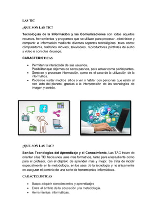 Este documento define y describe las TIC (Tecnologías de la Información y Comunicación), TAC (Tecnologías del Aprendizaje y Conocimiento) y TEC (Tecnologías del Empoderamiento y Participación). Las TIC permiten procesar y compartir información a través de dispositivos tecnológicos e involucran interacción entre usuarios. Las TAC buscan orientar las TIC hacia usos educativos para aprender mejor. Y las TEC utilizan tecnologías como Twitter, Facebook y YouTube para promover la cohesión social