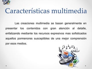 Este documento describe las características de la tecnología multimedia, incluyendo la interactividad, ramificación, navegación y transparencia. Explica los tipos de información que se pueden incluir en un sistema multimedia como texto, imágenes, animación, video, sonido, chat e hipervínculos.