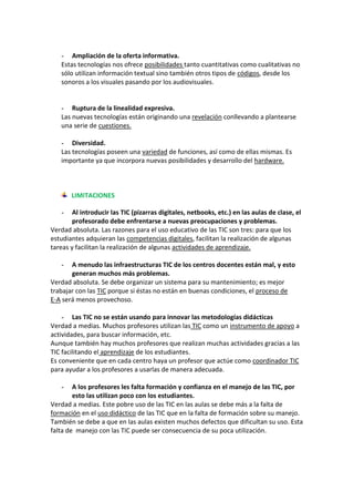 El documento describe las posibilidades y limitaciones de las nuevas tecnologías en la educación. Entre las posibilidades se encuentran la inmaterialidad, interconexión, interactividad e instantaneidad de la información digital, así como su capacidad para mejorar la calidad de imagen y sonido y penetrar en todos los sectores. Sin embargo, también presenta limitaciones como la necesidad de formación del profesorado, problemas con la infraestructura tecnológica, y el riesgo de distracción de los estudiantes si no se usa de forma adecuada.