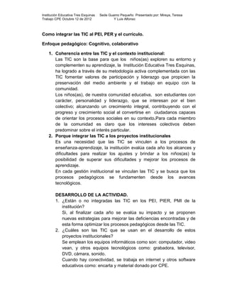 El documento describe cómo la Institución Educativa Tres Esquinas ha integrado las TIC en su PEI, PER y currículo de una manera coherente con su contexto institucional. Se usan equipos como computadores, video beam, cámaras y software educativos para complementar el aprendizaje de los estudiantes. Las TIC se evalúan anualmente para mejorar los procesos pedagógicos y se usan enfoques cognitivos y colaborativos.