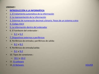 Este documento introduce los conceptos básicos de informática. Explica que la informática trata la información de forma automática mediante máquinas electrónicas, y divide el procesamiento de datos en tres etapas: entrada de datos, procesamiento y salida de resultados. También describe los componentes principales de un ordenador como la CPU, memoria y periféricos, los sistemas de numeración binario y decimal, y diferentes tipos de software y hardware.
