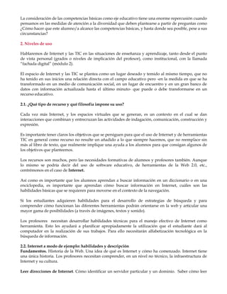 Este documento presenta un curso sobre el uso de las TIC para atender a la diversidad en el aula. El curso consta de cuatro módulos que cubren temas teóricos, tecnológicos, prácticos y de repaso. El documento describe las herramientas TIC que los profesores pueden utilizar para investigar sobre este tema, como motores de búsqueda, foros, recursos multimedia y organizadores de información. También explica diferentes niveles de integración de Internet en la enseñanza y el aprendizaje.
