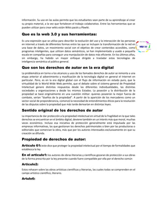Este documento trata sobre diferentes temas relacionados con la tecnología de la información y la comunicación (TIC) en el contexto educativo. Explica brevemente las TIC y las NTIC, la Web 2.0 y sus herramientas, la Web 3.0, los derechos de autor en la era digital, el software libre y su uso en instituciones educativas. También define conceptos como páginas web, características y tipos de páginas web.